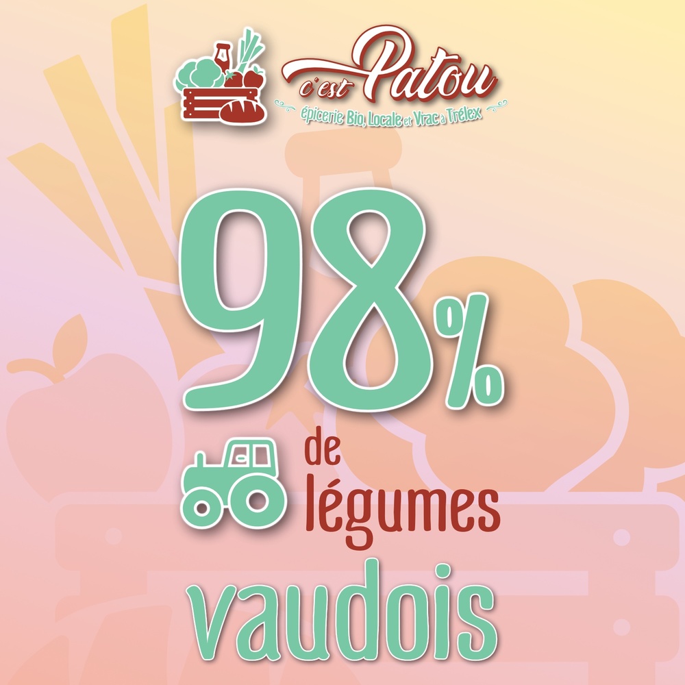 Cette semaine, en nous penchant sur nos légumes, nous nous sommes aperçus, non sans fierté, que nous avions 98% de légumes vaudois ! La seule "rebelle" de nos étals étant la patate douce, dont la saison sous nos latitudes n'est pas encore atteinte.