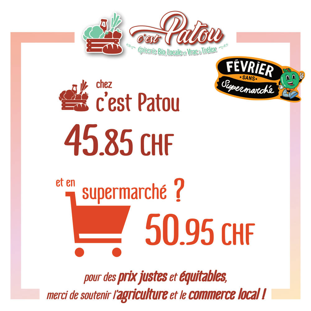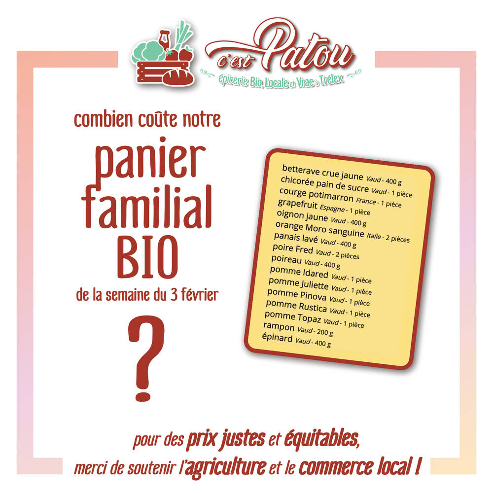 Nous avons fait l'exercice, ce 3 février dernier, de comparer les prix de notre panier familial, rempli de bons fruits & légumes BIO et de saison. Chez nous il vous était proposé à 45.85 CHF.