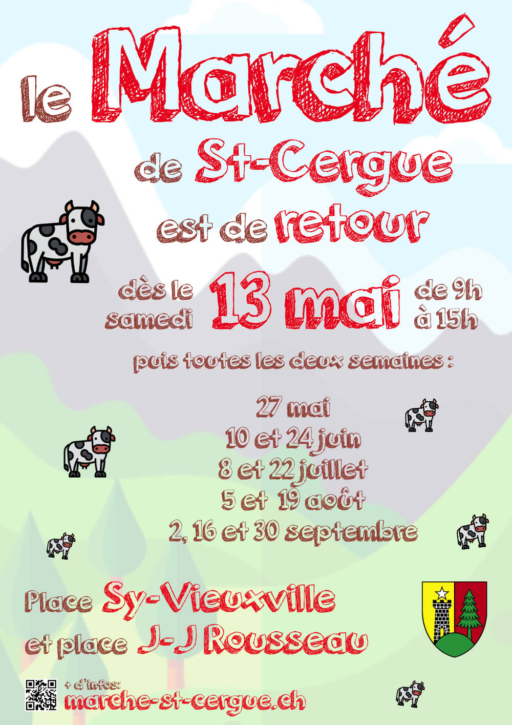 Dès samedi 13 mai, retrouvez-nous également au marché de St-Cergue. Nous vous proposerons une offre de fruits et légumes BIO, locaux et de saison ainsi que quelques autres articles (farines, miels, boissons, etc...).