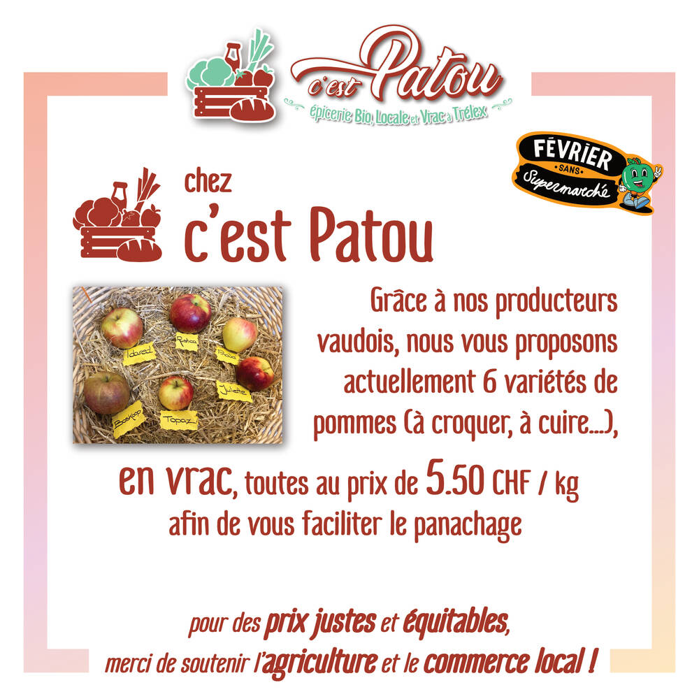 Grâce à nos producteurs vaudois, nous vous proposons actuellement 6 variétés de pommes (à croquer, à cuire...), en vrac, toutes au même prix afin de vous faciliter le panachage.